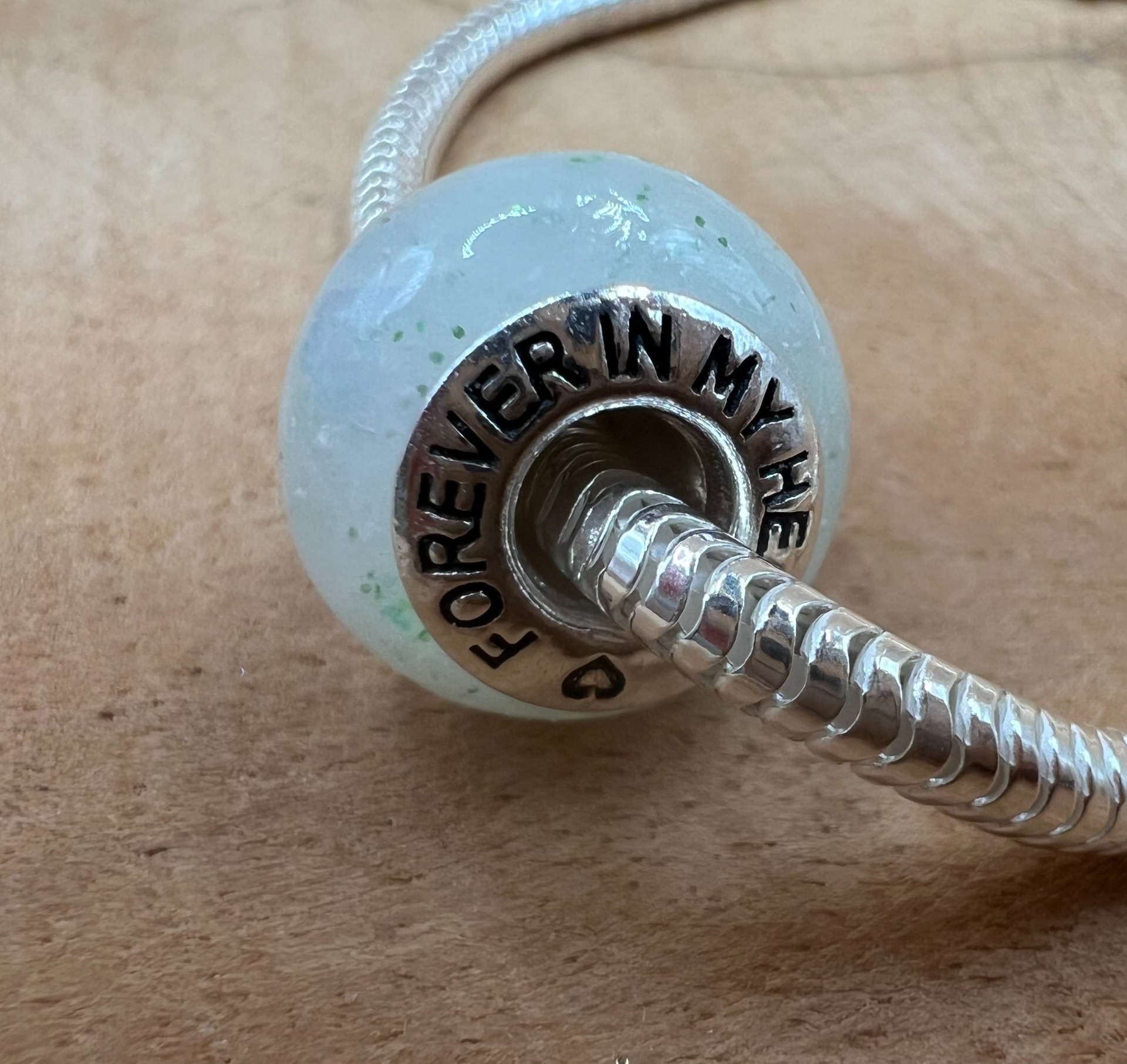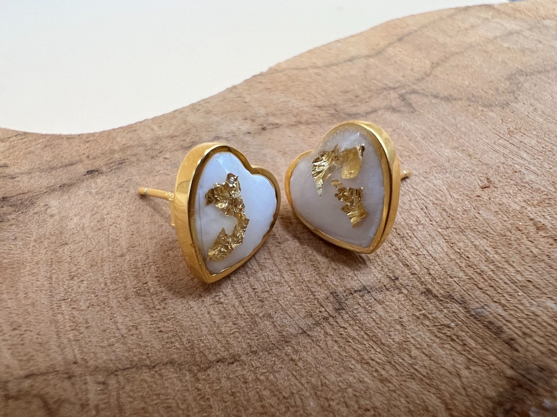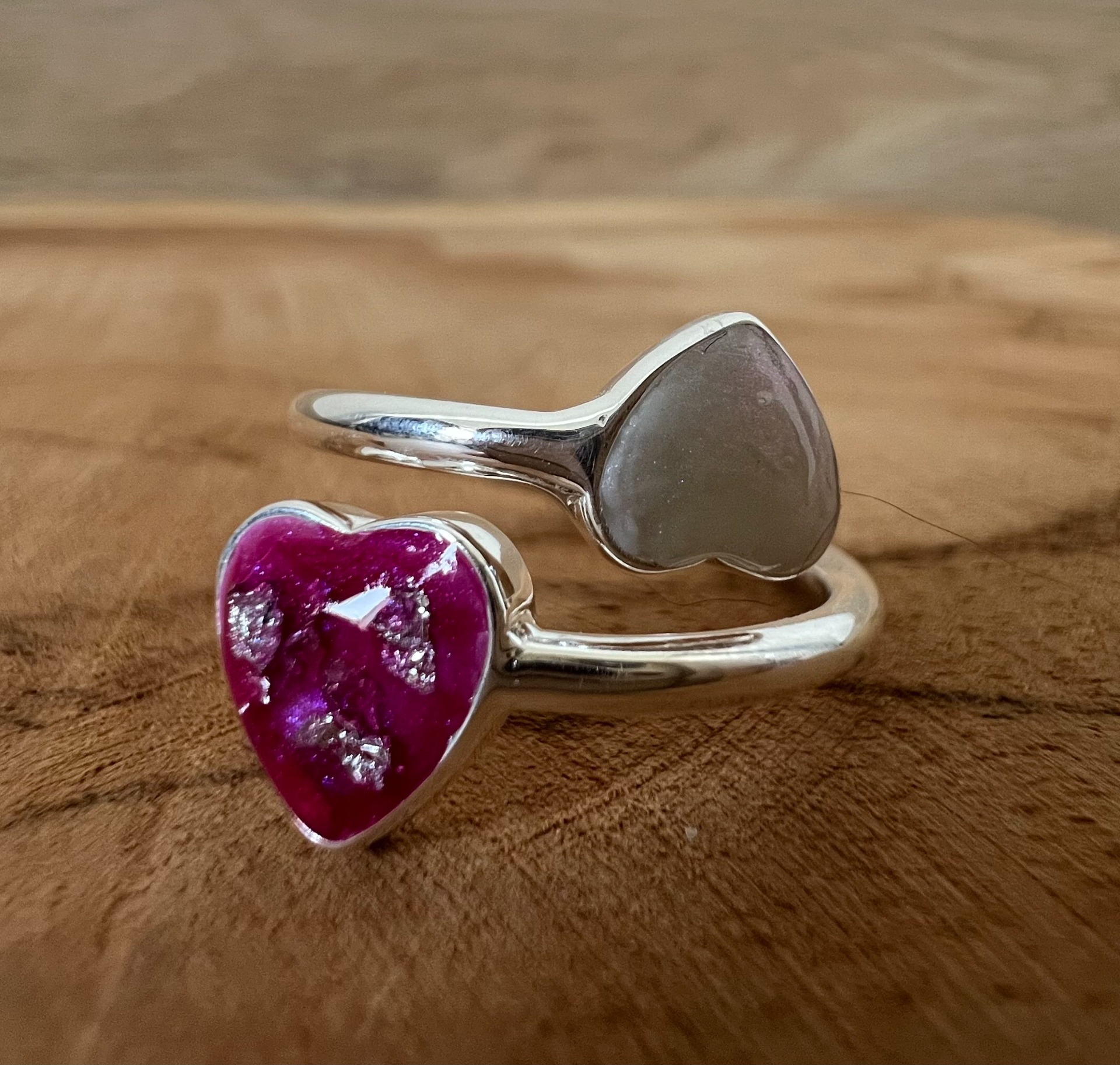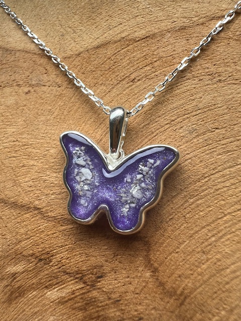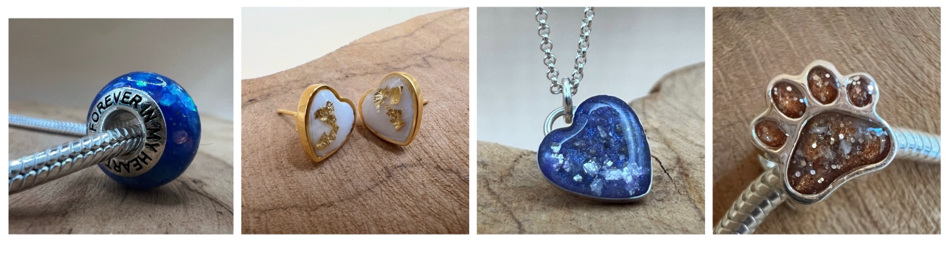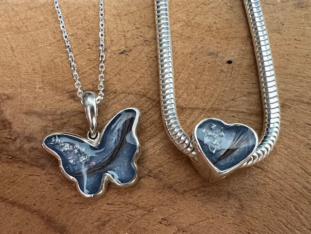 In mijn sieraden kan ik bijvoorbeeld crematie as, moedermelk of een lokje haar verwerken, of iets anders persoonlijks naar wens, bijvoorbeeld een goud/zilver vlokje of bloemetje. Elk sieraad is uniek en kan gemaakt worden in elke gewenste kleur.